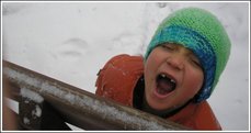 Makes Me Happy | Main | Richard Pryor Dies December 5, 2005Hooray For SnowHooray for snow!! Wisconsin is actually acting like Wisconsin this winter and giving us a nice, heavy blanket of snow. The boys have delighted in it, and we all went sledding yesterday. I whimped out, though and didn't sled but watched them. After we came back home and ate chili and sourdough bread. Mmmmmm. All we need is a fireplace and I'd be in heaven!! Here's one of the twins catching snow on his tongue. (click for larger)