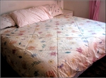 There's some blue tape on it that I can't get off. The "head" delivery guy suggested some Goo Be Gone or something. Dude, don't YOU have some on hand? Isn't removing packaging tape part of the delivery thing? Wah. So I still have this ugly tape on the lid, until I get around to getting that Goo stuffamajigger. At any rate, washer's here, I like it. Haven't formed a relationship with it yet, though. Still getting to know each other. It makes weird space ship sounds. Even the kids were like, What is that noise? But that's better than the old one that used to Irish dance across the room sounding like rocks in a steel barrel. One of my first missions with my new washer was to put it to the test with my king-sized comforter. I had washed it in the old machine, but it came out less than feeling clean. This one, though? Clean. Fresh. Looks and smells clean. That is lovely. Since I was down there snapping pictures, I got one of my comforter/bed. For those of you accustomed to a nicely made bed, you may want to look away or stand the chance of freaking out on my tousled linens. And for those who can't stand mismatched pillowcases, walk away. after Nothing like fresh smelling sheets. Mmmmm. Well, I'm off to get more hairs zapped from my chin. Have a good one.