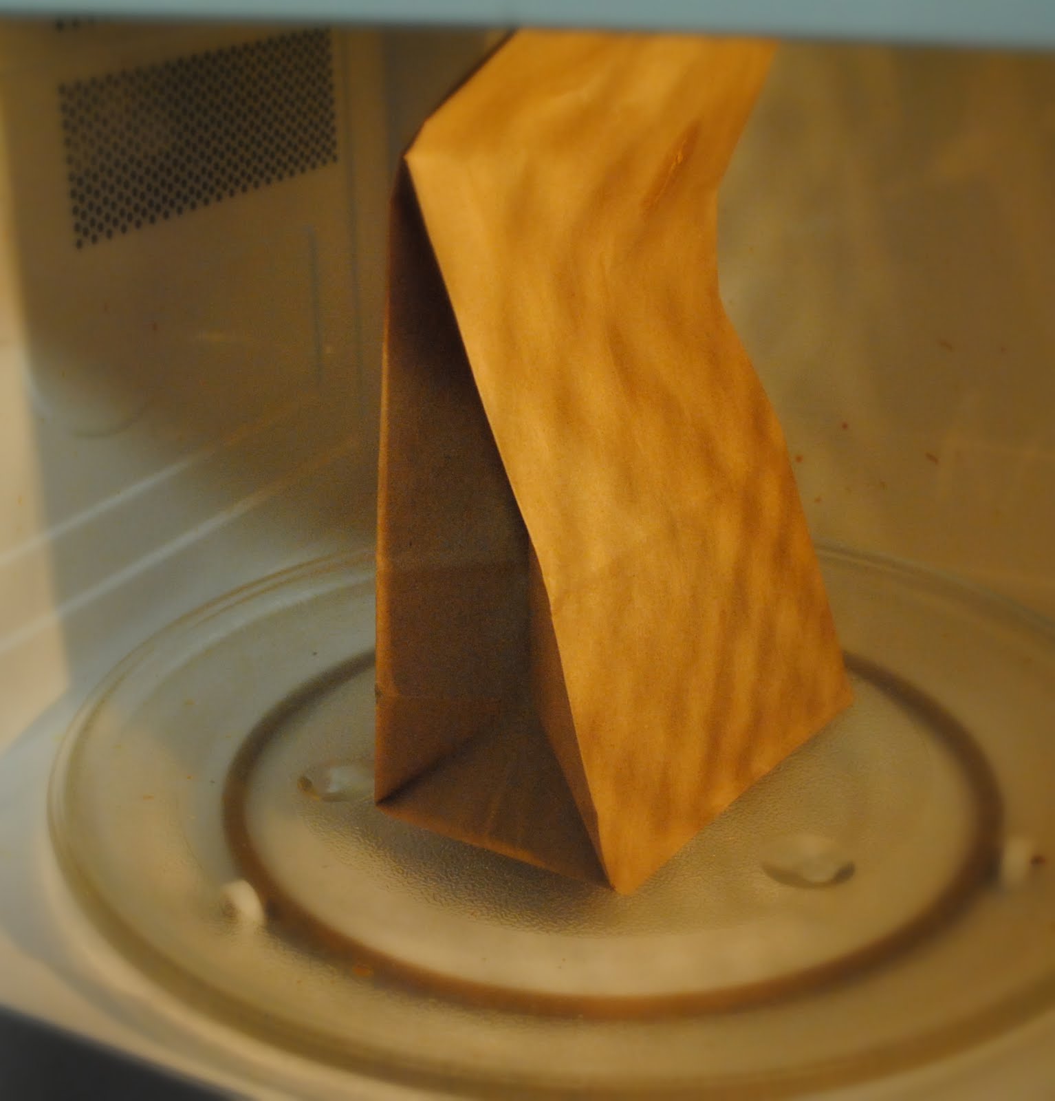 All you need is 1/3 cup of popcorn, a brown bag (lunchbag) and a microwave.